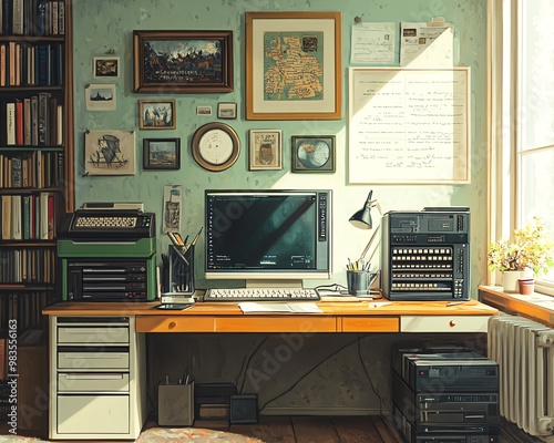 Modern depiction of a writer s workspace with various writing tools and tech gadgets, clean and engaging design, bright and inviting atmosphere