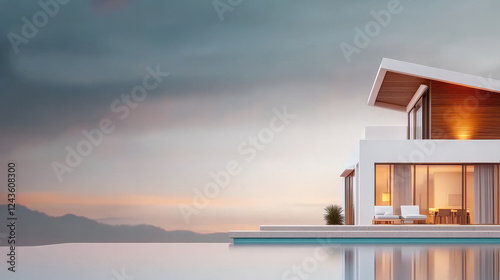 Modern Desert House Infinity Pool Sunset - Minimalist architecture, serene landscape, tranquil pool, luxurious living, sunset view. Represents peace, luxury, modern design, and escape.