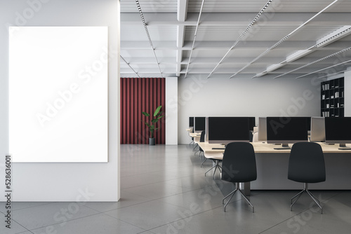Modern designer coworking office interior with empty white mock up poster on wall, furniture, bookcase and equipment. 3D Rendering.