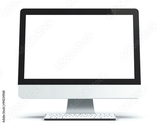 Modern desktop computer with a large blank screen and wireless keyboard, isolated on a white background.