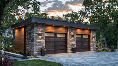 Modern Detached Garage at Dusk: A contemporary two-car garage, featuring dark wood siding, natural stone accents, and recessed lighting, stands majestically at dusk.