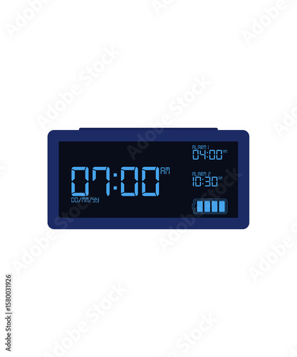 Modern Digital Alarm Clock Displaying Time, Date, Alarms, and Battery Status in Blue Backlit Screen