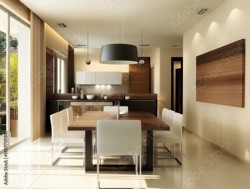 Modern dining room showing a modern kitchen with dining table