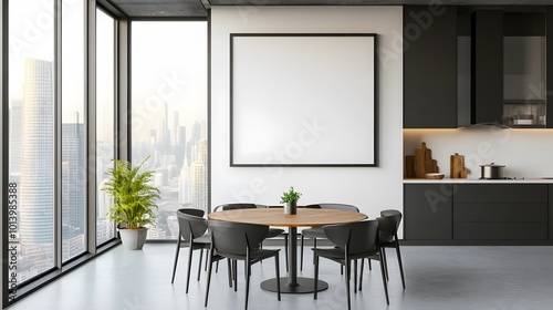 Modern dining room with a round table and chairs, large windows, and a minimalistic kitchen, featuring an empty frame on the wall, perfect for adding posters