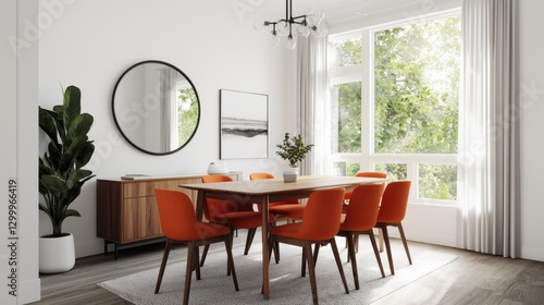 Modern Dining Room with Bright Orange Chairs and Natural Light