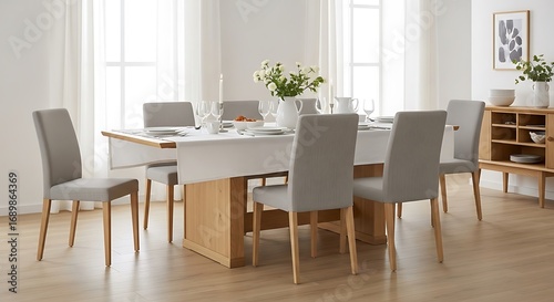Modern Dining Room with Light Oak Table and Gray Chairs.