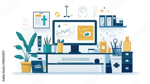 Modern doctor's office workspace with computer, charts, and medical equipment.