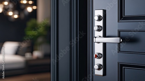 Modern door lock features multiple buttons and levers, showcasing sleek black metal design against a contemporary interior backdrop