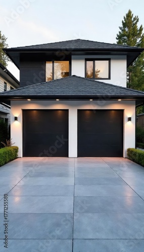 Modern double car garage doors open to reveal a clean, neatly paved driveway Perfect for real estate, home improvement, or architectural websites , exterior, luxury