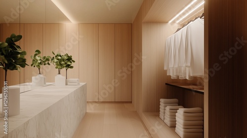 Modern Dressing Room: An inviting and modern dressing room, featuring sleek wooden paneling, a long marble countertop with potted plants, and a rack of neatly hung clothes and towels.