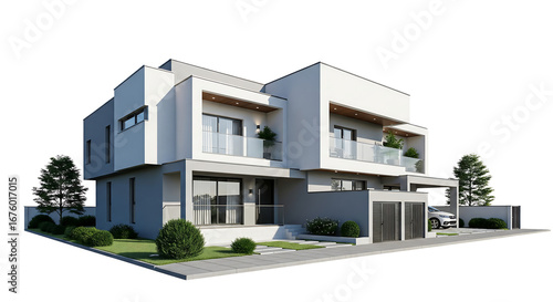 Modern Duplex Home Design With Landscaping And A Car Isolated Rendering