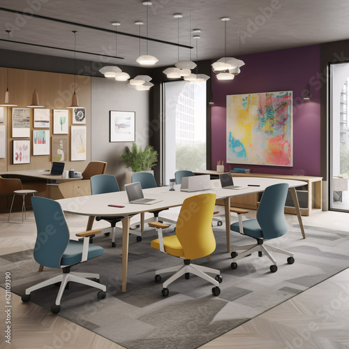 Modern, dynamic, creative, positive, motivating, functional office, workplace, workstations, meeting space, breakout area interior with desks, tables, ergonomic chairs. Artistic flair. Generative AI.