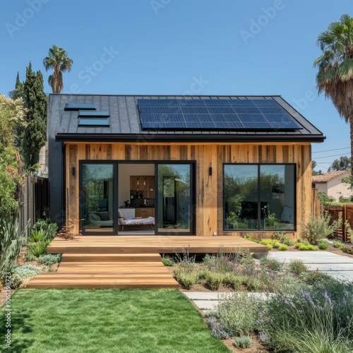Modern Eco Friendly Home with Solar Panels Deck and Landscaped Yard