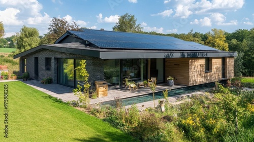 Modern Eco House Featuring Solar Panels in a Serene Rural Setting During Daytime