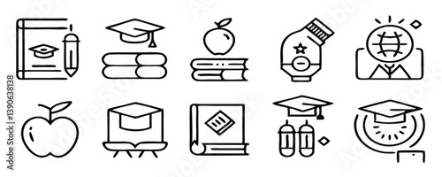 Modern Education and E-Learning Icon Set – Flat Line Vector Icons for School, Online Courses, Teaching Tools, Academic Subjects, and Virtual Learning Platforms.