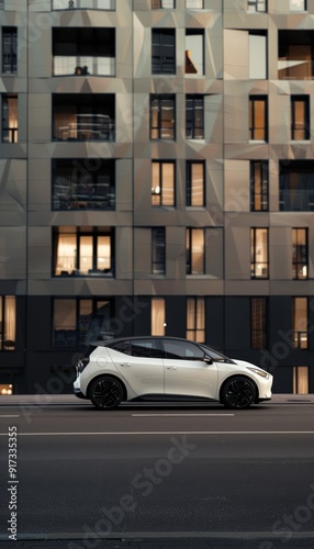 Modern Electric Hatchback Car Navigating Urban Street with Eco-friendly Architecture