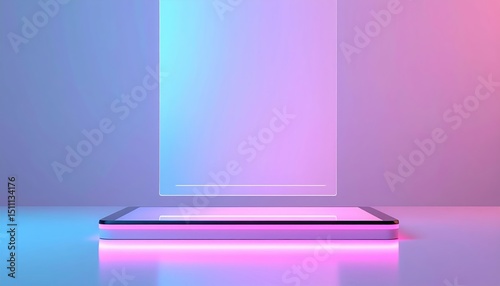 Modern electronic device with sleek design illuminated by vibrant pink and blue neon lighting on smooth reflective surface