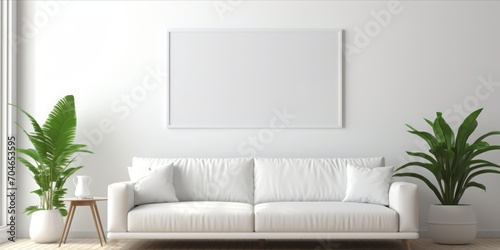 Modern Elegance: A Minimalistic Living Room Mockup Featuring an Empty Picture Frame Against a Crisp White Wall, Perfect for Showcasing Contemporary Interior Design