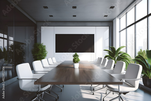 Modern empty conference room with large conference table and large screen TV on the wall. A workplace that is simply designed