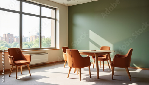 Modern empty conference room with warm lighting, comfortable orange chairs and green wall, workspace optimization concept, interior design companies, office furniture suppliers.