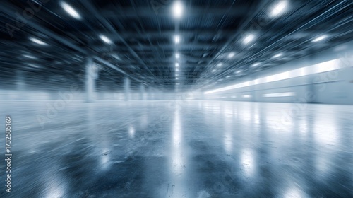Modern empty industrial warehouse interior with bright overhead lighting and reflective floors creating a sense of vastness and futuristic appeal