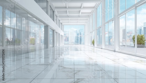 Modern empty office hallway with city view