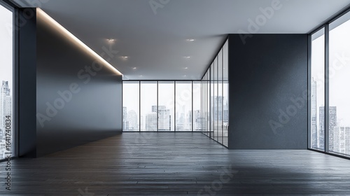 Modern Empty Office Interior with Large Windows and Dark Wooden Floor for Commercial Use