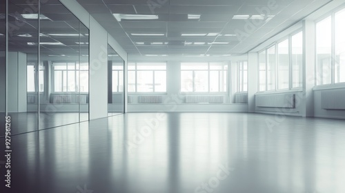 Modern empty office space with reflective floor, large windows allowing natural light, and minimalistic style featuring clean lines and a monochrome color palette.