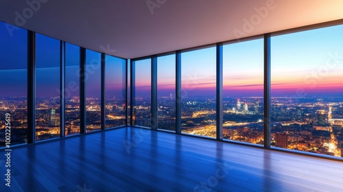 Modern empty room with large windows overlooking the illuminated cityscape at night from a skyscraper.