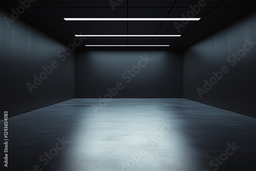Modern empty room with sleek black walls and bright ceiling lights for creative possibilities and artistic expression