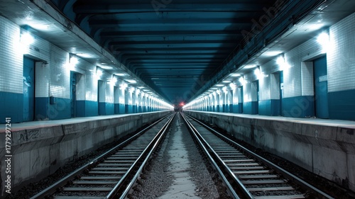 Modern empty subway station interior with tiled walls, curved railway tracks, and bright fluorescent lights creating a clean underground transit atmosphere