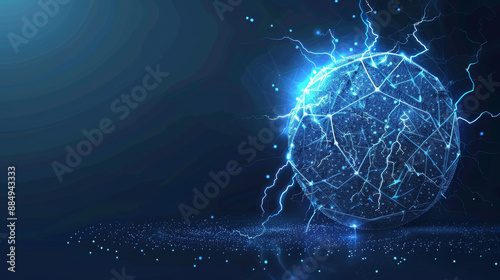 Modern energy storage device with lightning symbols in spheres. Sustainable power future. Glowing low polygonal vectors on dark blue.