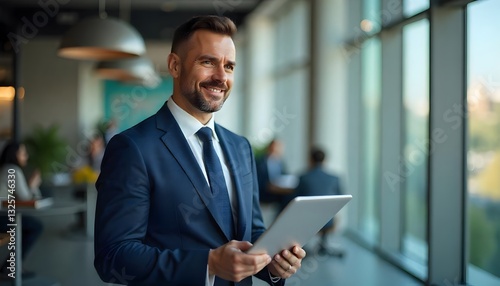 Modern Executive: A confident businessperson, clad in a sleek suit, holds a tablet, peering out the window and dreaming of success in a contemporary office setting.