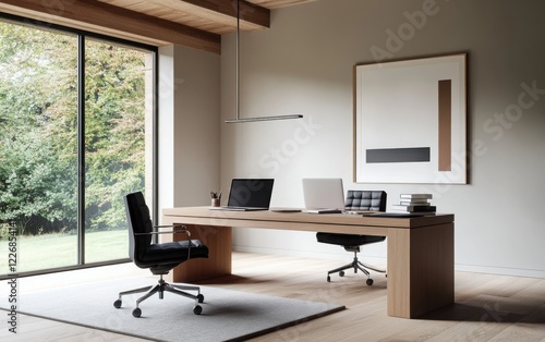 Modern executive office with a sleek oak desk, a state-of-the-art laptop, and a contemporary black chair.