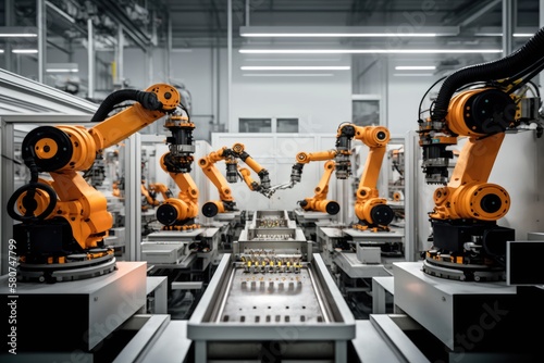 Modern factory using artificial intelligence robots and innovative technology, AI futuristic industry concept, AI generated