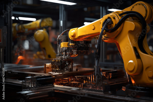 Modern factory using robotic arm works welding in the industrial mega factory, artificial intelligence and innovative technology, AI industry