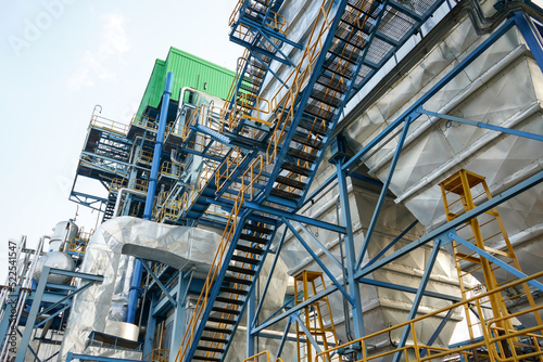 Modern factory with many pipes and tanks with stainless steel construction. This factory can produce various kinds of processed products such as oil.
