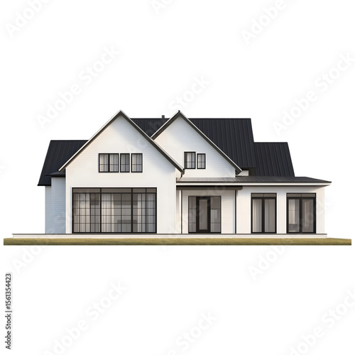 Modern farmhouse style white exterior house with black metal roof and large windows isolated on transparent background