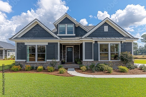 Modern farmhouse, sunny day, landscaping, curb appeal, real estate