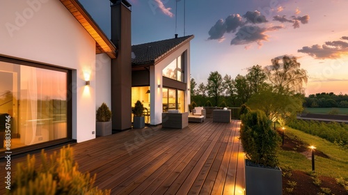 modern farmhouse with a wooden deck overlooking a suburban landscape, with stylish outdoor lighting