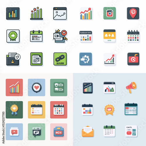 Modern flat icon set of analytics, planning, KPIs, and marketing elements like charts, megaphones, and social media. Ideal for web dashboards and presentations.
