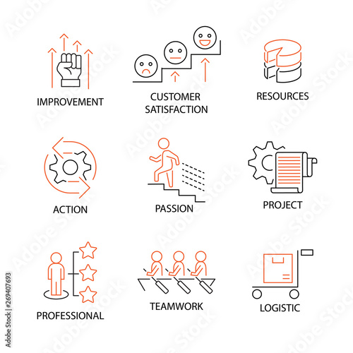 Modern Flat thin line Icon Set in Concept of Business and Human Management with word Customer Satisfaction,Improvement,Resources,Action,Passion,Project,Professional,Teamwork,Logistic. Editable Stroke.