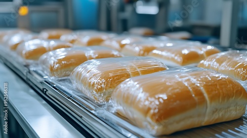 Modern Food Processing Machinery Packaging Freshly Baked Bread on Conveyor Belt