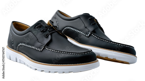 Modern Footwear: A pair of sleek, black shoes with pristine white stitching and soles, embodying contemporary elegance and comfort.