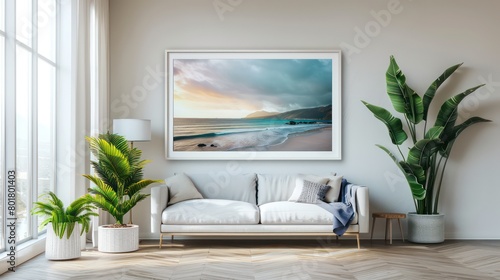 modern frame hanging on a wall, in a well lit coastal living room, frame is empty mock up