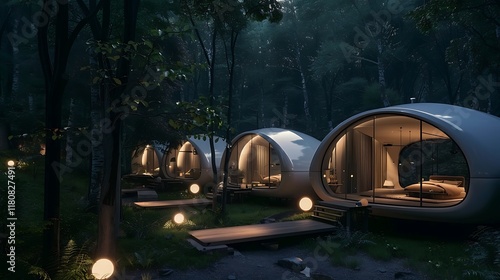 Modern Futuristic Capsules Nestled In A Dark Forest