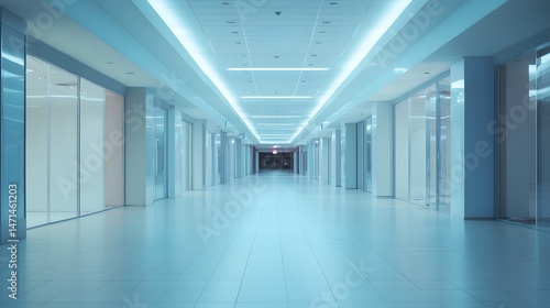 Modern futuristic corridor, sleek white walls and floors, ambient blue lighting, ideal for tech or innovation themes.