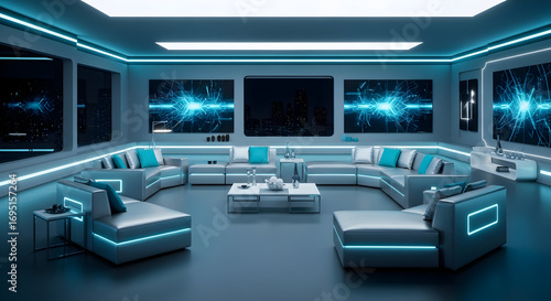Modern Futuristic Living Room Interior Design with Neon Lights and Digital Displays