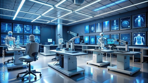 Modern futuristic medical laboratory with advanced robotic arms, microscopes, and computer screens displaying data and 3D models of human anatomy for research and analysis.