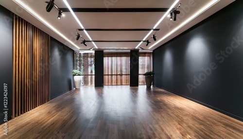Modern gallery interior with dark walls, wooden flooring, and ceiling lighting, creating a contemporary and minimalist aesthetic. 3D Rendering
